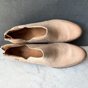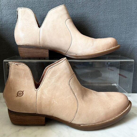 Born Kerri women's size 9 bootie. Tan full grain leather western style upper has cut outs and back zipper. Cushioned footbed; rubber outsole and low block heel. Excellent condition.