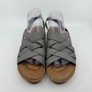The Born Laila Leather Ankle Slingback Wedge Sandals in blue-gray offer effortless style and comfort. Size US 10M. Crafted with a durable rubber sole and quality leather upper, these slip-on wedge sandals provide a comfortable lift and a secure fit for all-day wear.