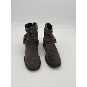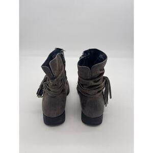 Born brand round toed booties. Leather wraps around the ankles with a tassel on the side. Has an inner ankle zippers. Has some wear around the toe but good used condition. Brown/grey color.