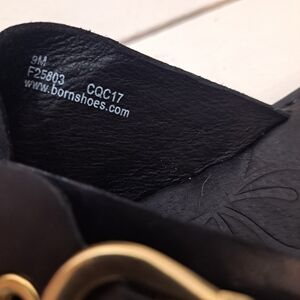Born Leather Sandals Black Open Toe Flats Slides With Gold Buckle Women's Size 9 Wide Used In Great Condition.