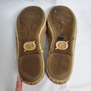 Born Slip On Flats. Size 9. Fabric Upper, Leather Lining. Tan and orange tones. Gently used condition with no rips or stains.