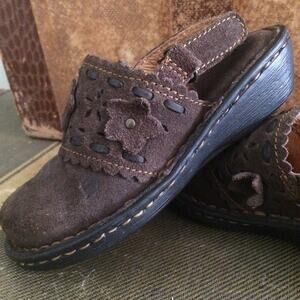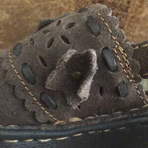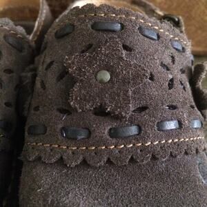 Very cute! Brown suede with Velcro straps.