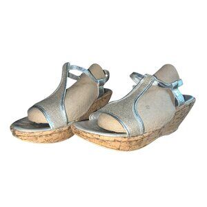 Born MJJ7 Silver Canvas & Leather Peep Toe Slingback Wedges Sz 10 Womens Wooden