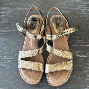 Elegant metallic gold sandals by Born. Features stylish straps and an adjustable buckle for a comfortable fit.