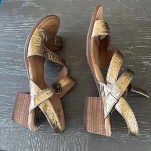 Born Metallic Gold Leather Strappy Sandals Mid Block Heel Casual Women’s Size 7M GUC