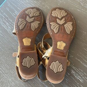 Elegant metallic gold sandals by Born. Features stylish straps and an adjustable buckle for a comfortable fit.