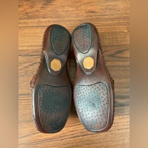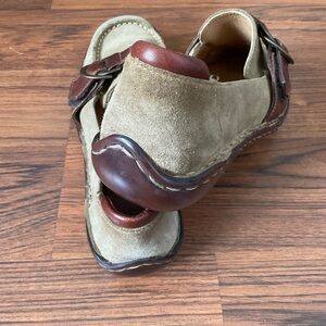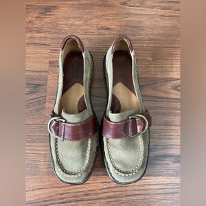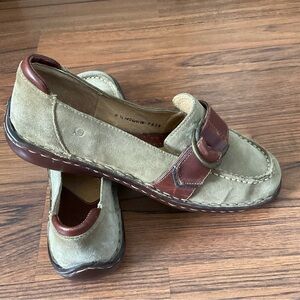 These Born moccasins feature a classic design with a two-tone brown and tan color scheme. The visible stitching around the toe highlights their moccasin construction, while the slip-on style ensures easy wear. Ideal for casual outings, they blend comfort with timeless elegance.