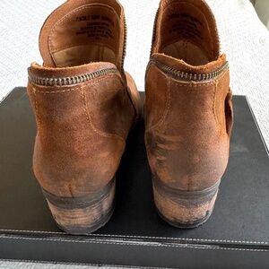 Born Montoro leather Moto booties in "glazed ginger" color. Side zip with tassel pulls. Wrap-around zipper extends around the top of the booties as an accent. Leather/suede, heavily distressed. Rubber soles withe stacked heel. Only worn a couple times. There is some scuffing on the inside heels (see photo) - I'm not sure if this was from wearing them or was just part of the distressing process. Size 7.5. Leather upper, fabric lining. Smoke free home.