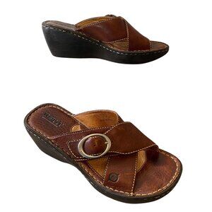 Born Sandals Womens Brown Leather Buckle Slip-On Wedge Shoes Size 7