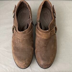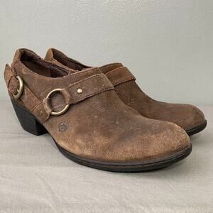 These Born "Zowy" distressed brown leather heeled low top harness ankle booties are in Excellent pre-owned condition. Labeled women's size 9.5. Heel measures 2" tall.
