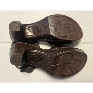 Born Stacked Heel Sandals Size 8 Brown Leather Stitched Closed Toe Ankle Strap. In good pre-owned condition, minor signs of wear. Please see all pictures for condition.