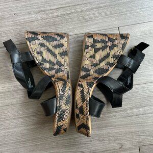 - Black leather strappy wedge heels from Born with a geometric black and tan pattern on the heel