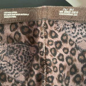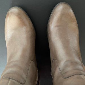 Born brand, tall knee-high boots with a round toe, rubber soles, animal print lining, and elastic vents on the inside of the calf, for some stretch. The color is brown but in certain lighting also looks gray (greige?). Either way, these boots are a fantastic neutral color. Leather upper and manmade balance. These are in very good, rarely worn condition.