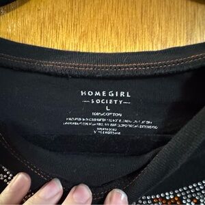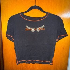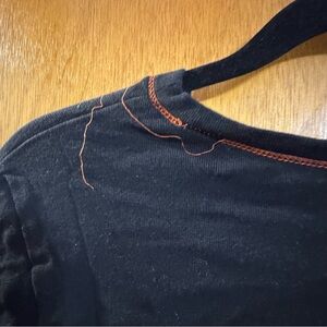 Black & orange HD style tee. Bedazzled “born to ride” with contrast stitching. Some of the stitching is coming loose (see photos). Easy fix (happened from washing)