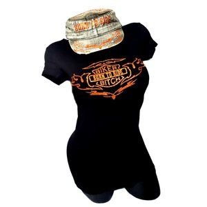 Born To Ride ~ Biker Bitch Fitted Spandex Tee with Shiny Glitter Lettering. ***** Cap available for purchase ****** SM - 3XL