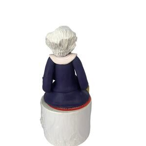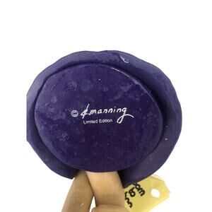 Seated Elderly Women wearing a purple dress with matching purse and pearls with rhinestone earrings and ring clutching a paper shopping bag!