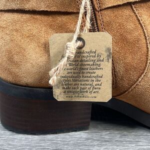 Born Women's Tori are ankle strap boots that are handcrafted by artisans. They have wraparound straps, a scalloped topline, and rounded toes. The boots have a breathable fabric lining and a suede-covered footbed with extra foam. They also have lightweight rubber outsoles for traction and grip.