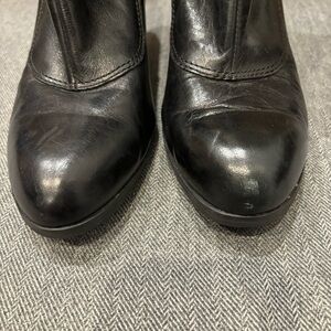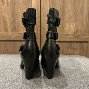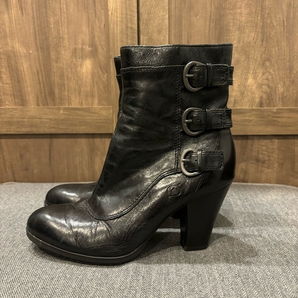 Born Vivi Black Leather Three Buckled moto Ankle Boots Size 7.5 Almond Toe