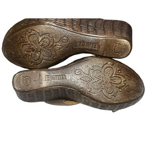 Features: Platform wedge; open toe; stitched welt; embossed B3rn logos on footbed and outsole; basketweave-textured wedge; comfort footbed; antiqued buckle hardware