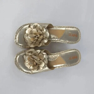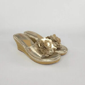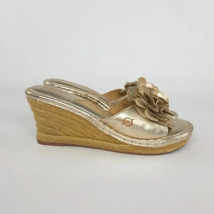 Born Wedgie Metallic Gold Sandals Leather 3D Flower Applique sz 9