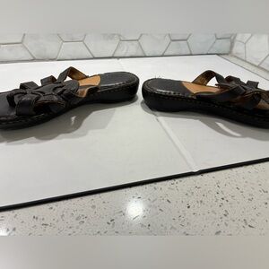 Born Woman’s Black Slide Sandal Size 6 Hand Crafted Leather Shield Design