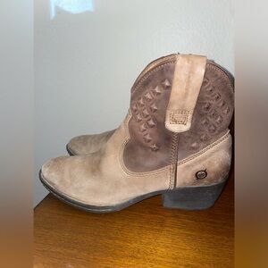 Used Born womens western booties size 7 1/2, color brown, with inner zipper. Suede inside, very comfortable, in good condition from a smoke free home