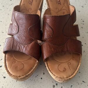 Born Women's Brown Leather Slip On Open Toe Sandals Block Cork Heels Platform Size 9