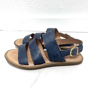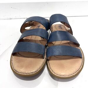 A pair of Børn brand sandals, specifically featuring a multi-strap design in a blue color, with a natural leather footbed. The sandals have an ankle strap with a buckle closure and are characterized by their handcrafted nature.