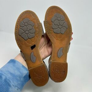 Keywords: Born sandals, women's gladiator sandals, gray leather sandals, summer footwear, casual sandals, pre-owned women's shoes, size 8M sandals, tie closure sandals, leather upper sandals, gladiator style, women's summer shoes, Born gladiator sandals, leather lining sandals, women's casual footwear, pre-owned Born sandals.