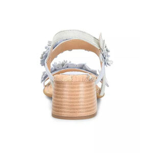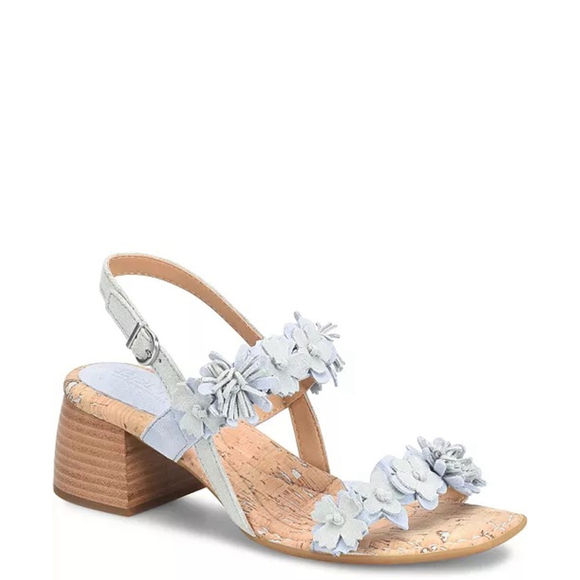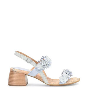 These light blue floral sandals feature a block heel and an ankle strap with a buckle closure. The upper consists of two straps adorned with layered floral appliques in varying shades of light blue. The footbed has a cork-like texture with a light blue insert at the heel, and the outsole is brown with a leaf-patterned tread. The heel is a stacked wood-look design. The sandals appear new with no visible signs of wear.