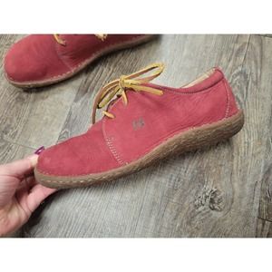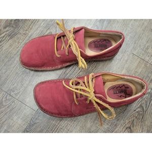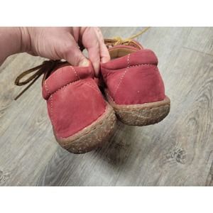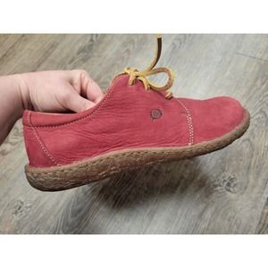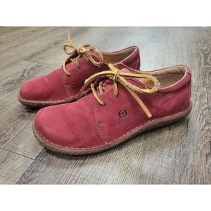 Stylish red moccasins by Born. Features tan laces for a classic touch. Ideal for casual outings.
