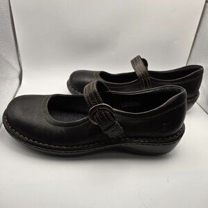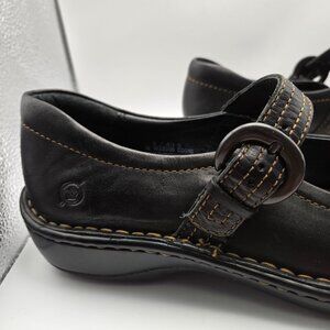 Born women's leather Mary Janes with adjustable elastic buckle strap. Black comfort flats with contrast stitching. Handcrafted high quality shoes. Left shoe strap elastic has some fraying, see last picture. Normal wear with good soles. Good used condition.