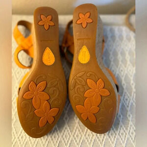 Born Women’s Size 9M Wedge Sandal with side straps, front cut in’s. Soft Leather Upper & Lining with cork sole and heel. Appropriate measurements: 3” heel in the back and 2” front. Pre-owned, gently worn. Non-slip bottoms. Pale Orange.