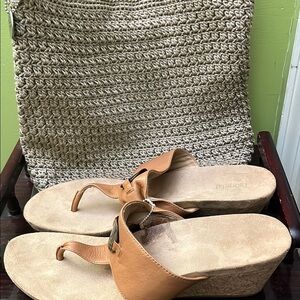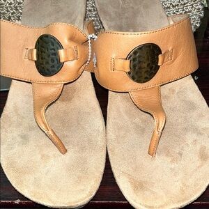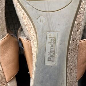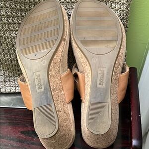 Step out in style with these Born wedge sandals. Featuring a chic tan color, these shoes offer both comfort and elegance. Perfect for any casual outing. Some glue spilled into the inside of one shoe. See pictures for details.