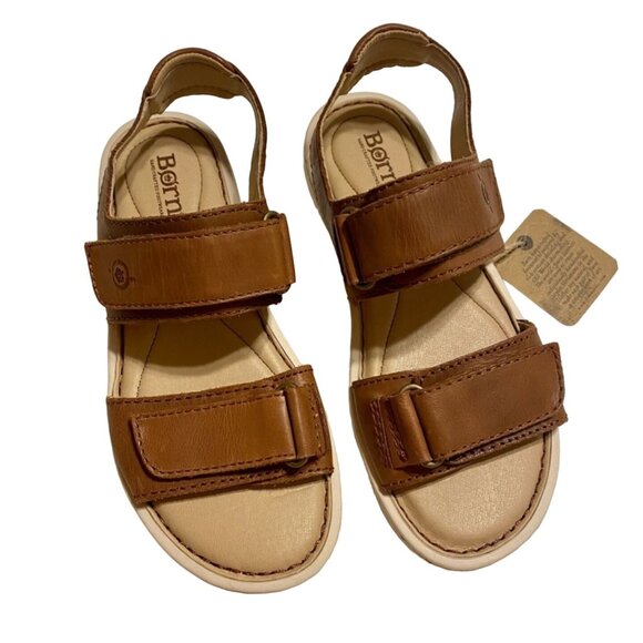 FEATURES/ACCENTS: Straps accents. Open toe. Comfort, cushioned foot bed. Brown color. Adjustable hook & loop strap Velcro closure, Lightweight,