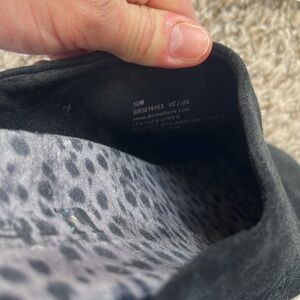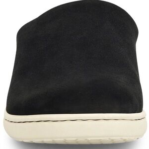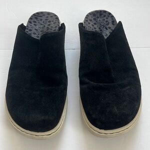 The image shows a pair of black Børn Zen mule slippers, featuring a black suede exterior and a cheetah-print faux fur lining. These slippers have a casual, slip-on design with a slightly raised heel and a white rubber sole. The Børn Zen Mule is known for its comfortable fit and stylish design, suitable for indoor and outdoor wear.