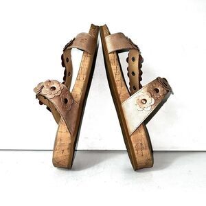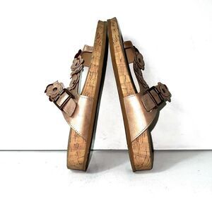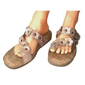 Born b.o.c Women's Size 9M Beige Faux Leather Sandals Slip On Flat Toe Ring Flowers Accent