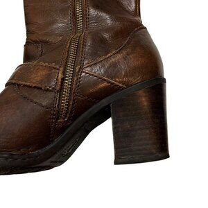 Born Shoes brown leather Treddy boots side zip buckle straps, moto style, block heel