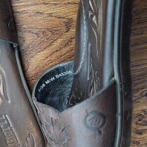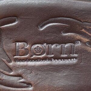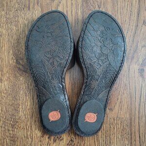 Size 7 braided brown leather slide sandals by Born. Cute and comfortable, with all leather uppers and footbeds. Leather footbeds shows signs of wear, but soles and braided leather upper are in very good used condition. Can be dressed up or down.
