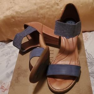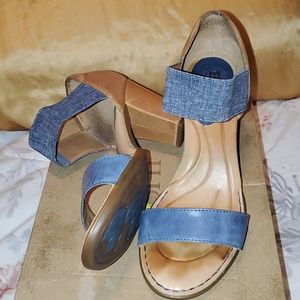 Born open toe shoes with navy blue across toe strap and blue jeans across front of foot