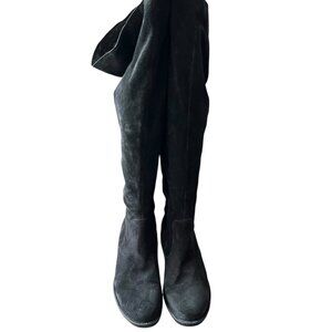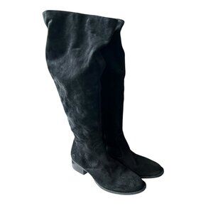 Born Cricket over the knee boots, solid black suede, 1/4 zip, almond toe, low block heel, cushioned insole, plaid fabric lining, women's 11, 21" tall shaft, 18" opening circumference, 1.5" heel, preowned and shows wear on the soles and suede, scratches on the heels - see photos