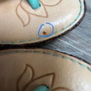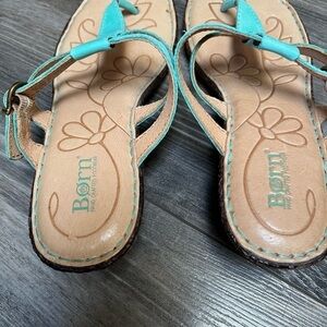 Born sandals, pretty teal color. Comfortable. Faux wood wedge heel. Pre-loved Has a spot on one shoe inside, see pics. Size 7