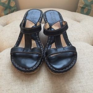 Low wedge, super comfortable!! Small tear in the right wedge. Barely noticeable.