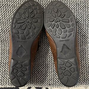 Elegant brown leather flats. Features decorative ribbon laces. Perfect for casual wear.