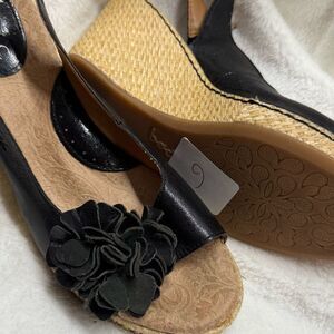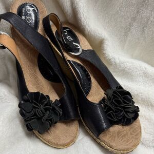 Born BOC Black Leather Floral Peep Toe Slingback Wedge Sandals size 9