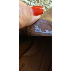 Slip on, stretch side panel, brown leather booties in size 6. Heels are 3 inches. No flaws. Size has partially rubbed off on one shoe, clear on other shoe, see pic for size.
