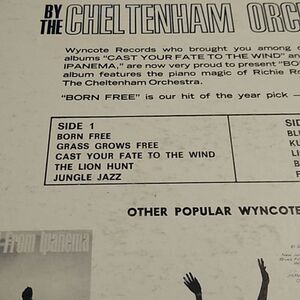 Vintage vinyl record featuring 'Born Free' by the Cheltenham Orchestra. Classic black cover with vibrant red and blue accents.