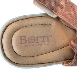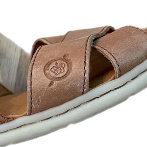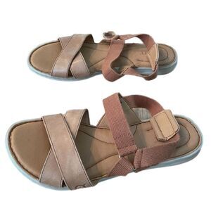 This summer sandal uses both leather and stretch fabric straps to ensure your all-day comfort. Full-grain leather upper with elastic strap. Leather-covered cushioned footbed. Rubber outsole.