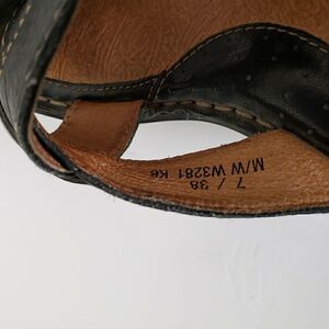 Super comfy wedge sandals. Slip on. Black leather. Pictures brightened to most accurately show any blemishes.