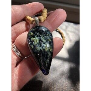 Th pendant has a galaxy effect of a dark background with silver and mossy green hints.